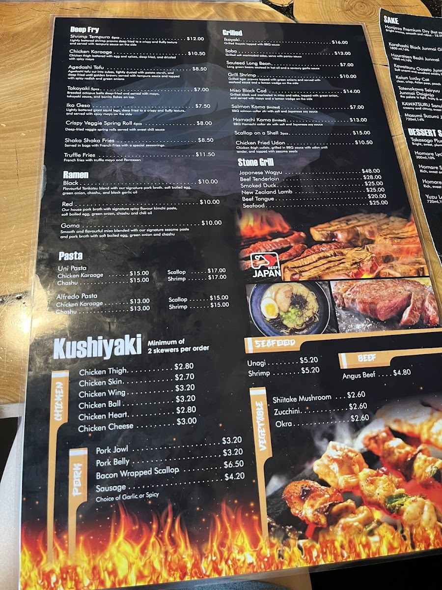 Additional menu highlights include ramen varieties like Goma Ramen and Red Ramen, sashimi selections such as Salmon and Hamachi Carpaccio, yakitori skewers, seafood options like oysters and lobster rolls, as well as grilled dishes including Wagyu beef and ikayaki.