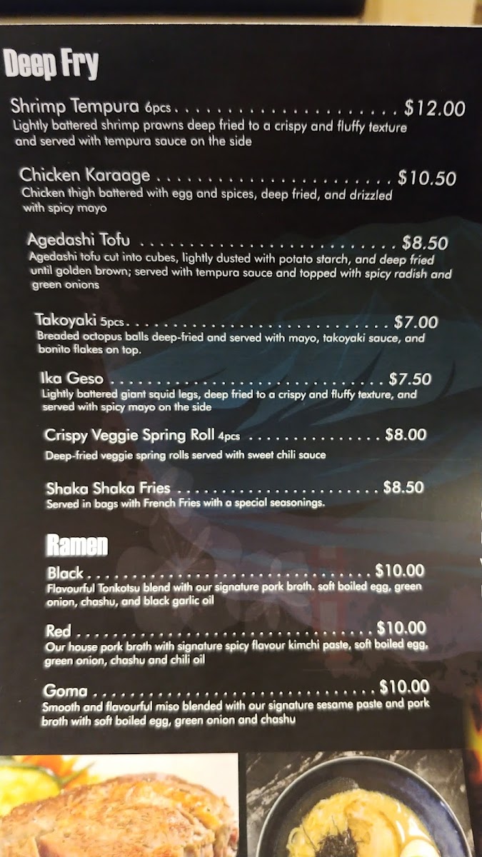 Located in Edmonton, this izakaya-style Japanese restaurant offers a diverse menu featuring traditional and modern Japanese dishes. The menu is organized into several key groups for easy navigation, presenting a variety of options including ramen, sushi, deep-fried items, and rolls.